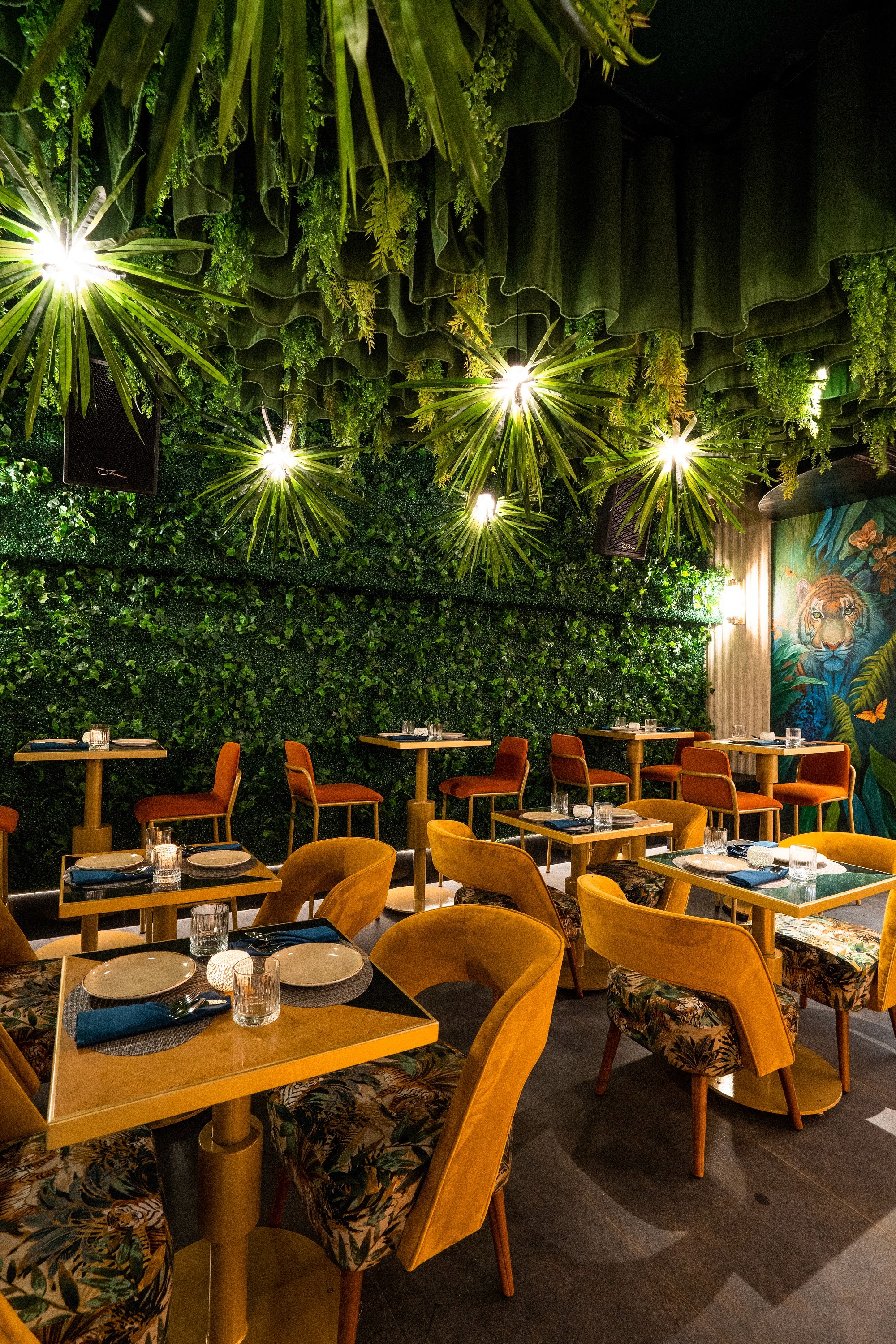 As visitors approach, they are enveloped by nature's and architectural design's exquisite harmony, immediately immersing them in the magical realm of "Badmaash." This theme is inspired by the image of a jungle, specifically one that is home to gorgeous tigers. Our goal is to create a setting that, like a true, dynamic sanctuary, not only shows the magnificence of these creatures but also inspires a profound sense of awe and reverence.The entry facade has been meticulously created to portray the sense of a vibrant and daring retreat. It combines the lush splendor of greenery with the sleekness of contemporary glass pieces, all in soothing green tones.