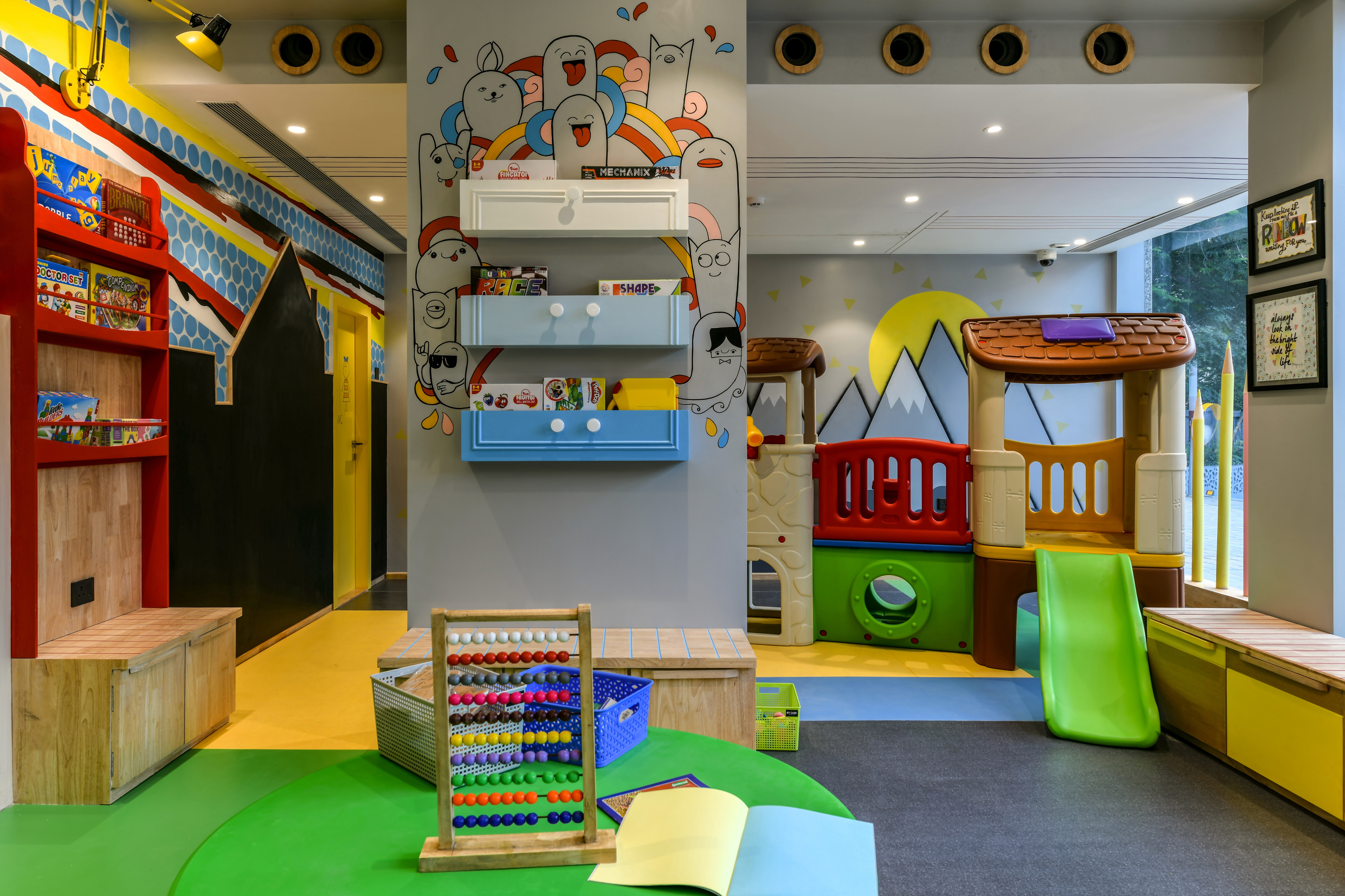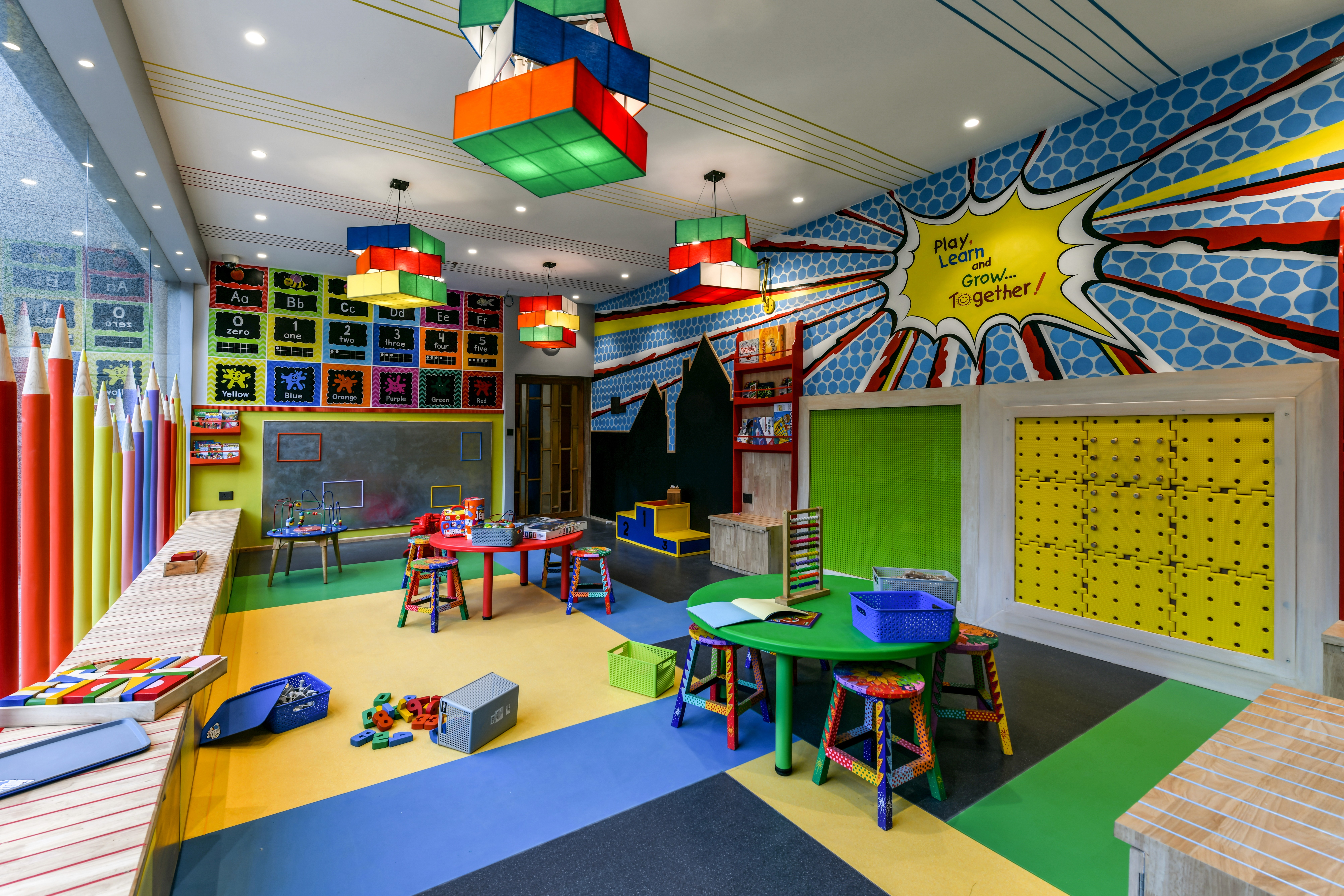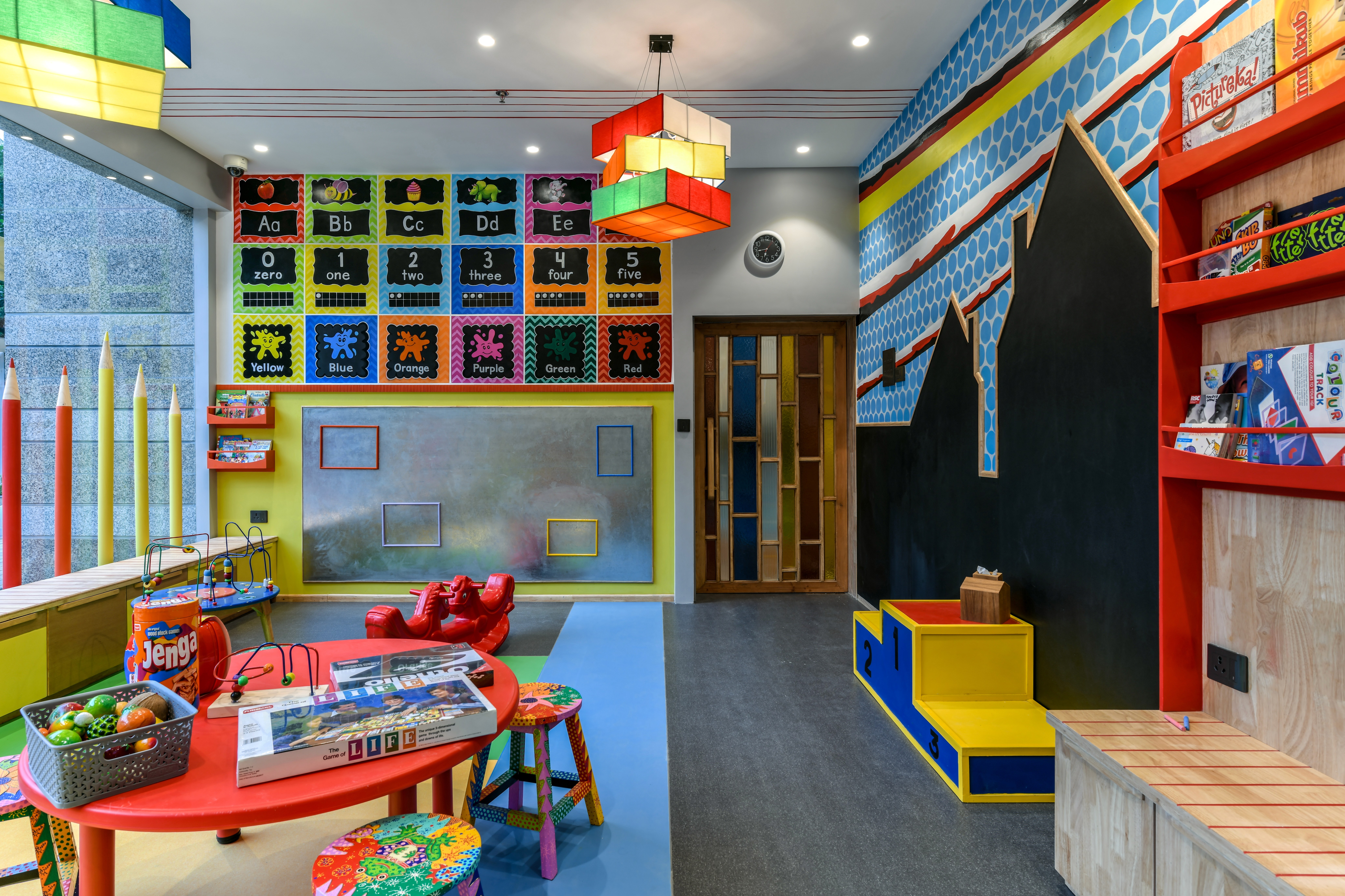 Designer Sapana Jain wanted to keep everything in sync with the idea of latest kid icons, games, cartoons, and learning. The interior is quite vibrant and playful and the walls are hand painted to give an artistic touch to the space. The front façade displays giant colorful pencils and the ceilings adorn lights, custom-made to look like giant Rubik’s cubes . Even the bathroom enjoys a colorful and fun theme of one of the favorite kids’ characters, the Minions. The PVC flooring is custom made to look bright and aid comfort to the curious little ones while they engage themselves in a number of activities provided by the designer to make the cozy place a small box full of surprises.