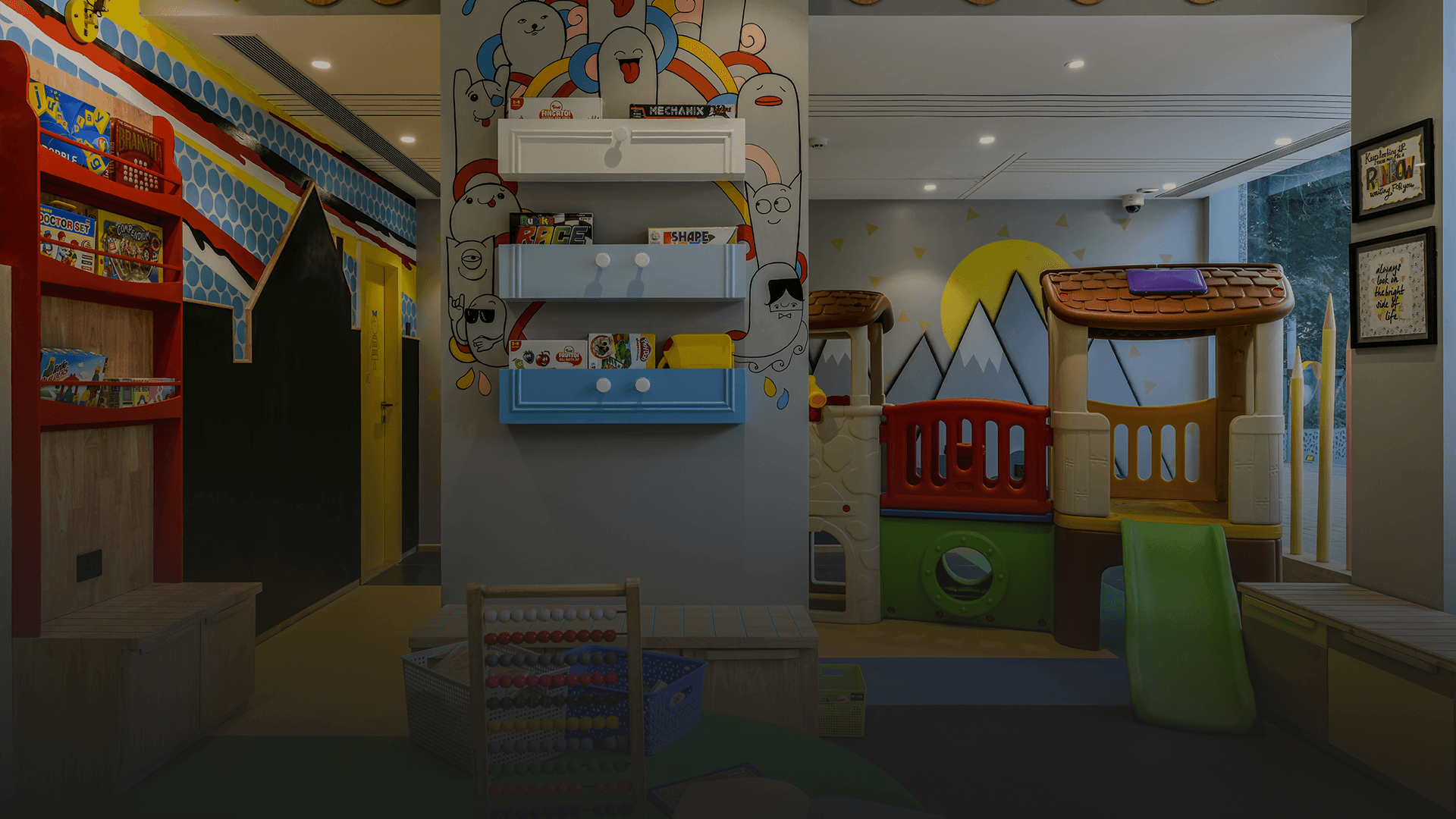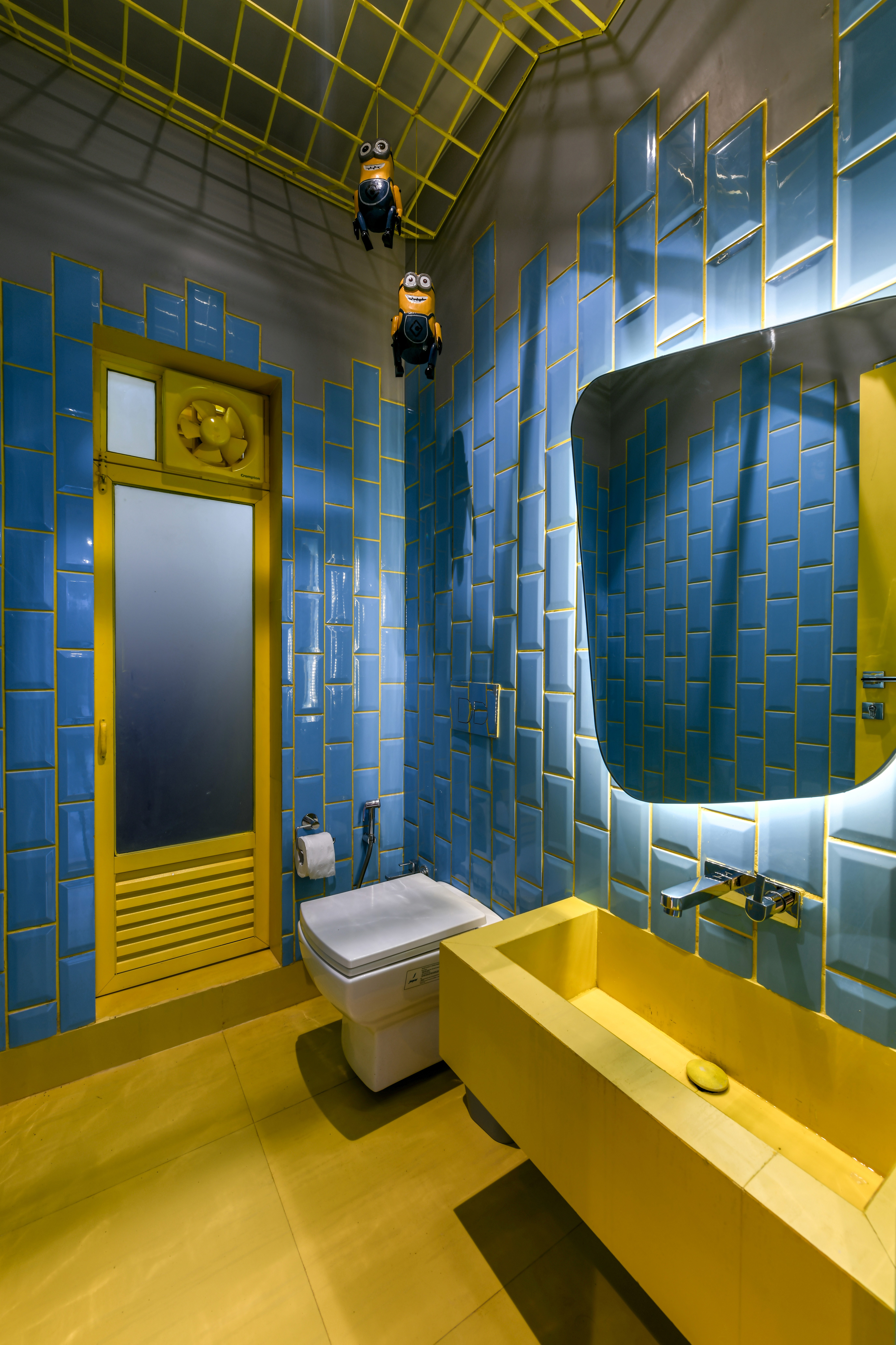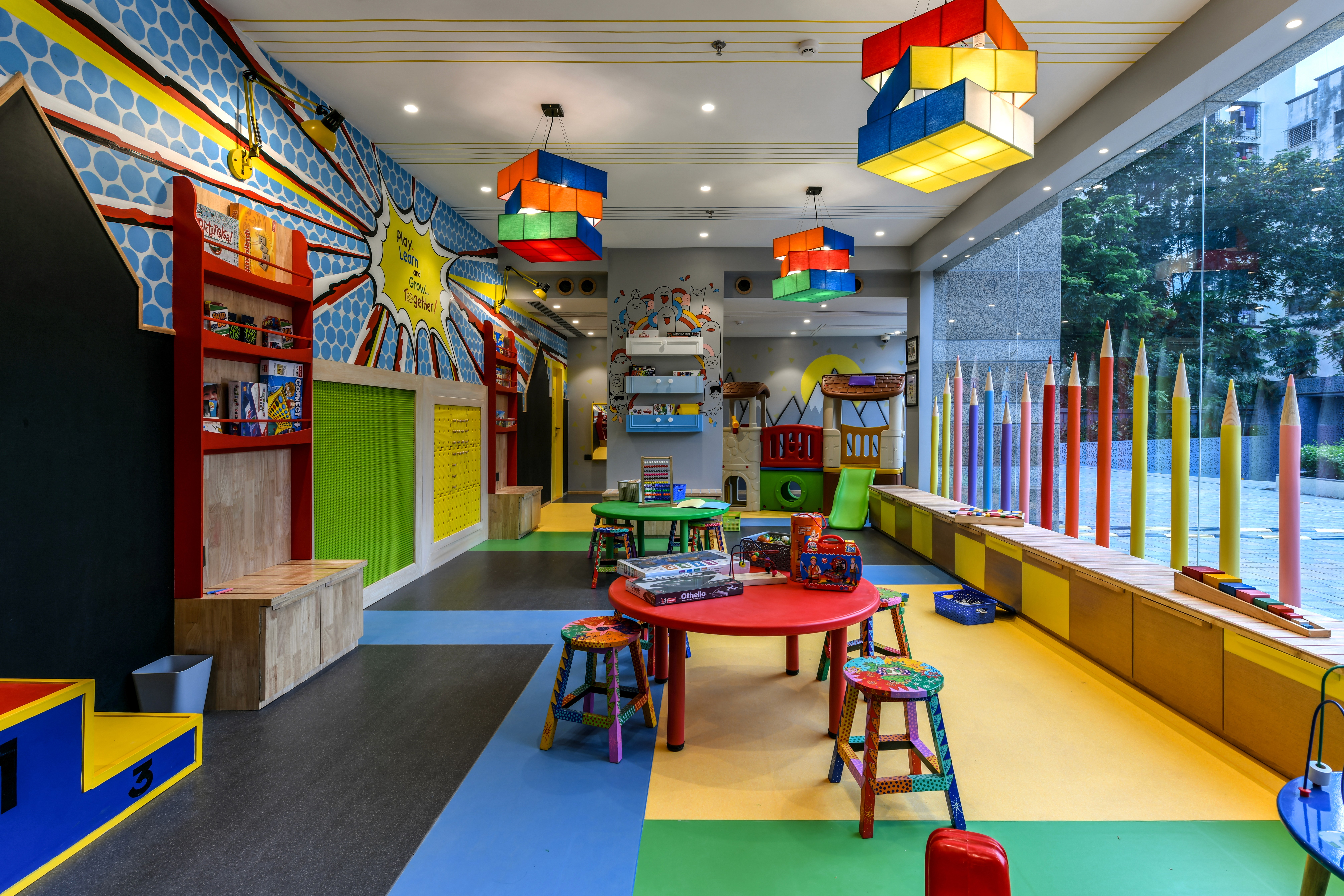 Designer Sapana Jain wanted to keep everything in sync with the idea of latest kid icons, games, cartoons, and learning. The interior is quite vibrant and playful and the walls are hand painted to give an artistic touch to the space. The front façade displays giant colorful pencils and the ceilings adorn lights, custom-made to look like giant Rubik’s cubes . Even the bathroom enjoys a colorful and fun theme of one of the favorite kids’ characters, the Minions. The PVC flooring is custom made to look bright and aid comfort to the curious little ones while they engage themselves in a number of activities provided by the designer to make the cozy place a small box full of surprises.