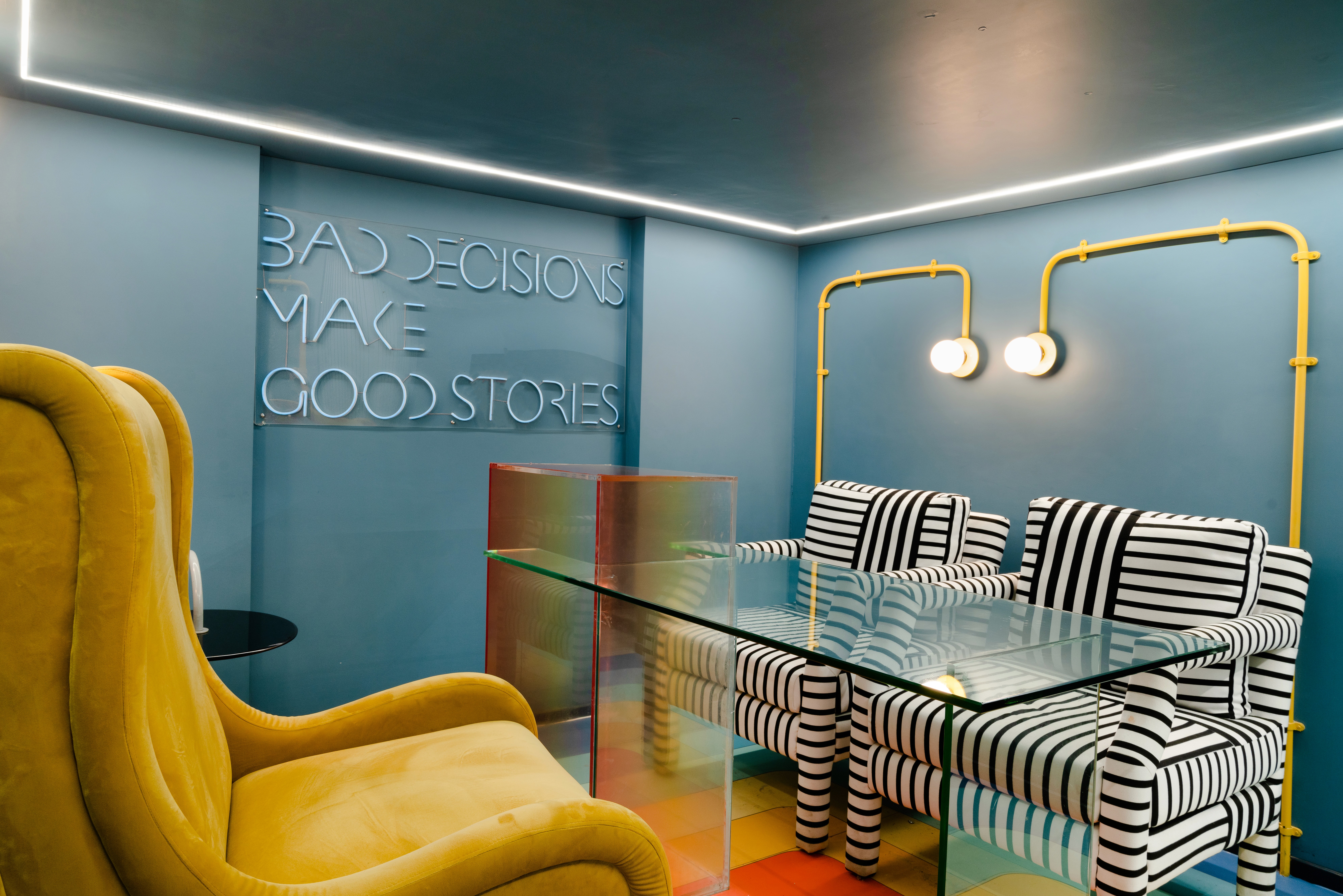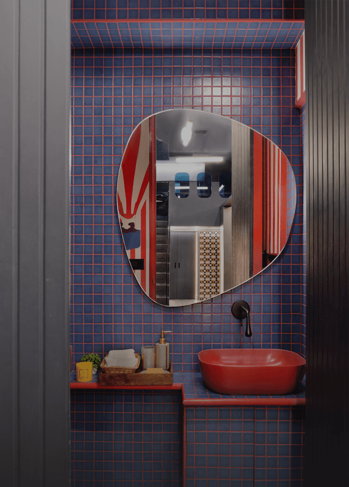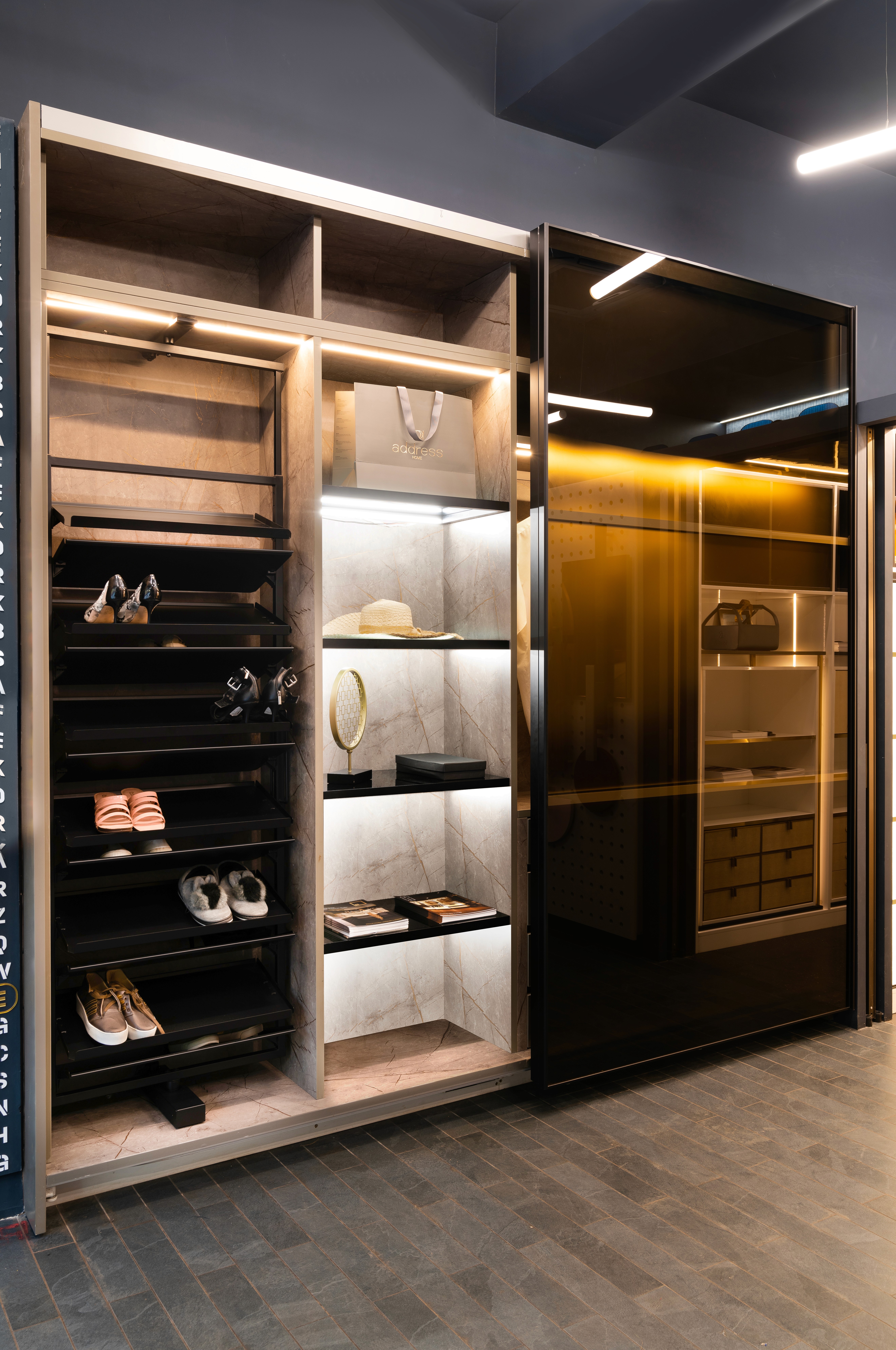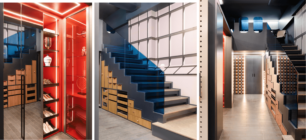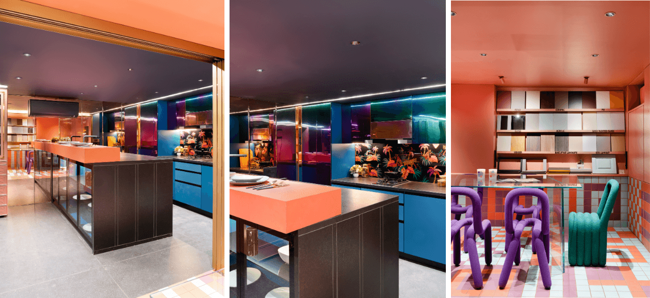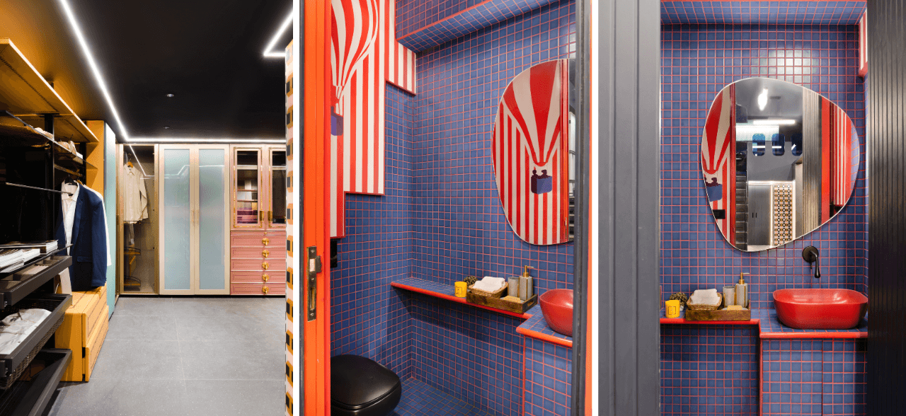 The bespoke entrance “peg wall” installation was designed around the client’s need to visualise new samples and freely experiment with layouts. A flexible system allows designers and clients to remove and add samples over time. As you move further in, an illusionary window near the staircase—created using customised wallpaper—pairs seamlessly with blue glass railings that guide you toward the conference room. The meeting space is defined by individually laid colourful tiles that form a striking pattern, setting it apart from the rest of the showroom. With Wardrobes and More, Sapana Jain Studio brings together unique prints, materials, and concepts to transform the everyday wardrobe space into an inspired design experience.
